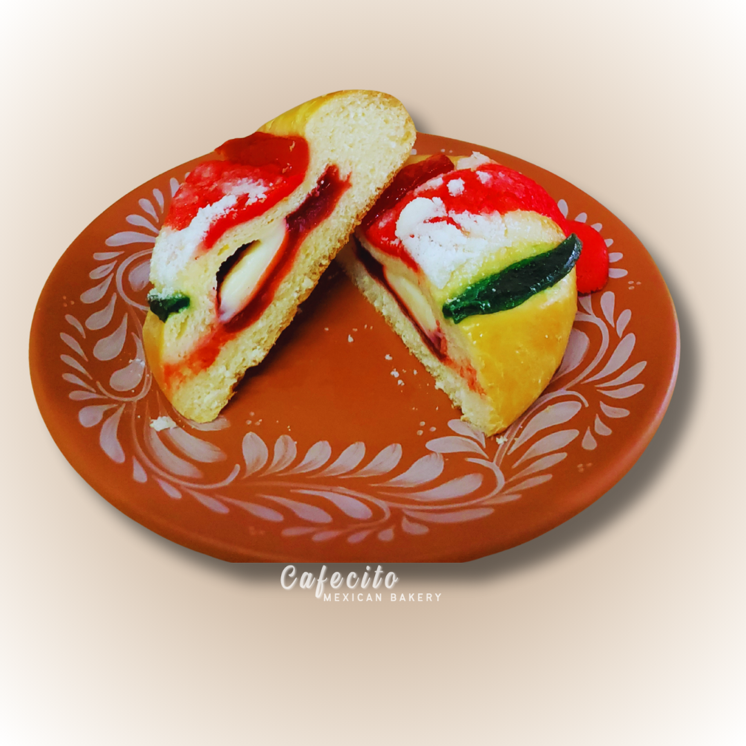Dia de los Reyes (3 Kings day) traditional bread. A soft and fluffy brioche style bun infused with a light hint of freshly grated orange zest, topped with candied fruit.